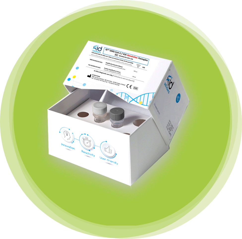 ID™ SARS-CoV-2 / VOC Revolution Pentaplex est un test de diagnostic in vitro par RT-qPCR, prêt à l’emploi, permettant la détection qualitative de l’ARN viral du SARS-CoV-2 et le criblage des mutations L452R, K417N et E484K du gène SPIKE.