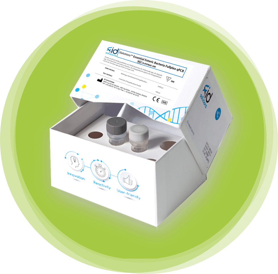 Le kit iSolutions™ Essential Enteric Bacteria Fullplex qPCR est un kit basé sur la technologie PCR en temps réel pour la détection qualitative de l’ADN provenant de Salmonella spp, Shigella spp, Escherichia coli entéro-invasive (EIEC), Campylobacter jejuni, Campylobacter coli et Yersinia spp.